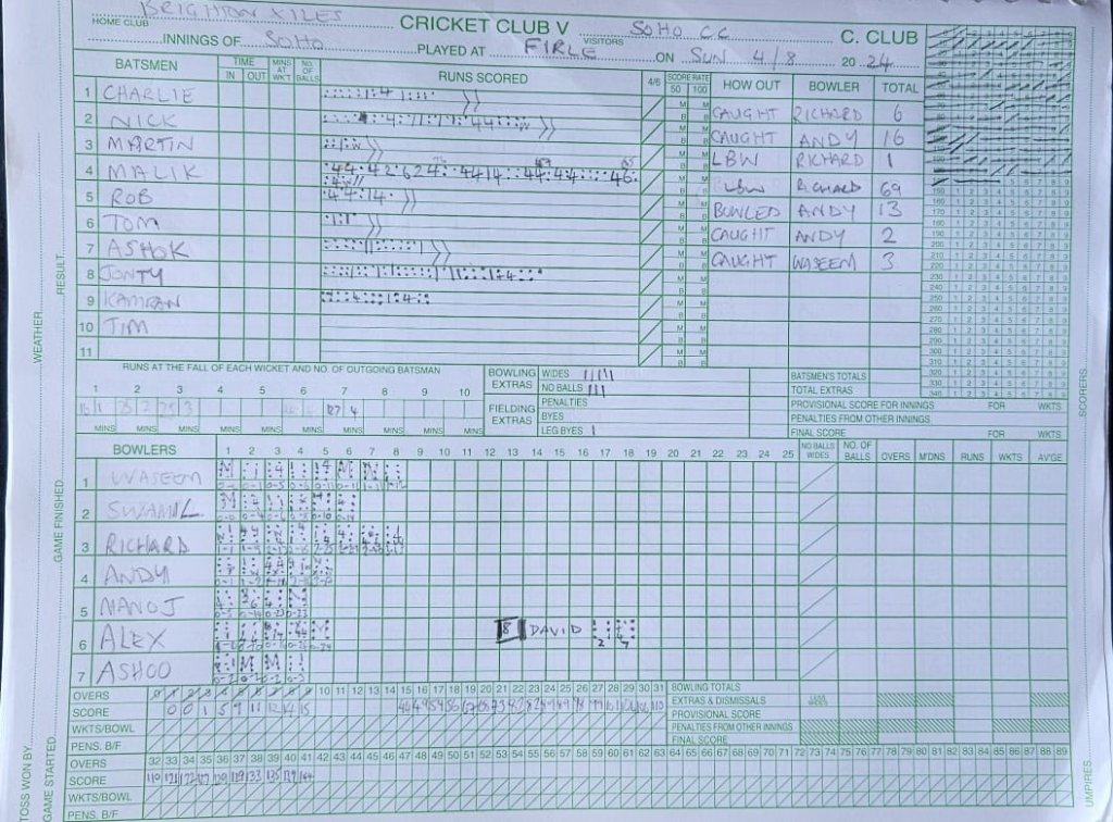 Xiles CC v SCC 4th August 2024 General 4 August 20244 November 2024 By Ad Min Video ResultsTeamRunsWickets LostOversOutcomeXiles229841DrawSoho Cricket Collective144738Draw Box ScoreArticleDetailsVenue Xiles Runs Balls 4s 6s Overs Maidens R Wickets 2290000008 Soho Cricket Collective Player Runs Balls 4s 6s Overs Maidens R Wickets Vlad622100000Nick Burnitoff16363080461Martin Collier19000000Malikovich694613292273Mullertov1393062152Thomas Price260070351Ash Patel323000000Jontin1147100000Kamran Malik923200000Chipmonkski000080451Aamer Mughal00000000 Extras14 Total1442212323841688 XilesCC-SCC_-4August2024_SCCinnings2 Image 6 of 6 Details Date Time League Season 4 August 2024 12:00 Not a league 2024 Venue Firle Cricket Club Firle, BN8 6NX, United Kingdom